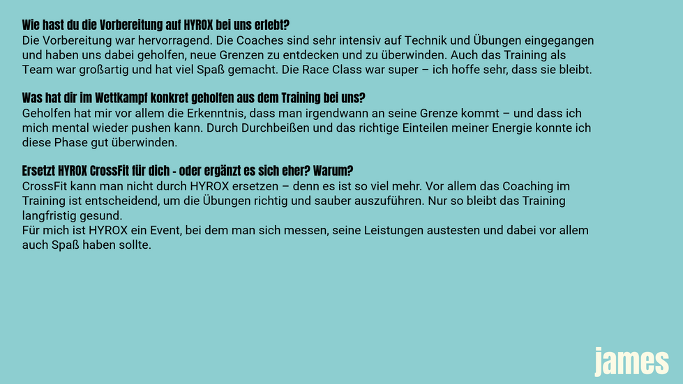 „Die Vorbereitung war intensiv, strukturiert und extrem motivierend. Man wird hier nicht einfach nur fit gemacht, sondern gezielt auf die Anforderungen von HYROX vorbereitet.“